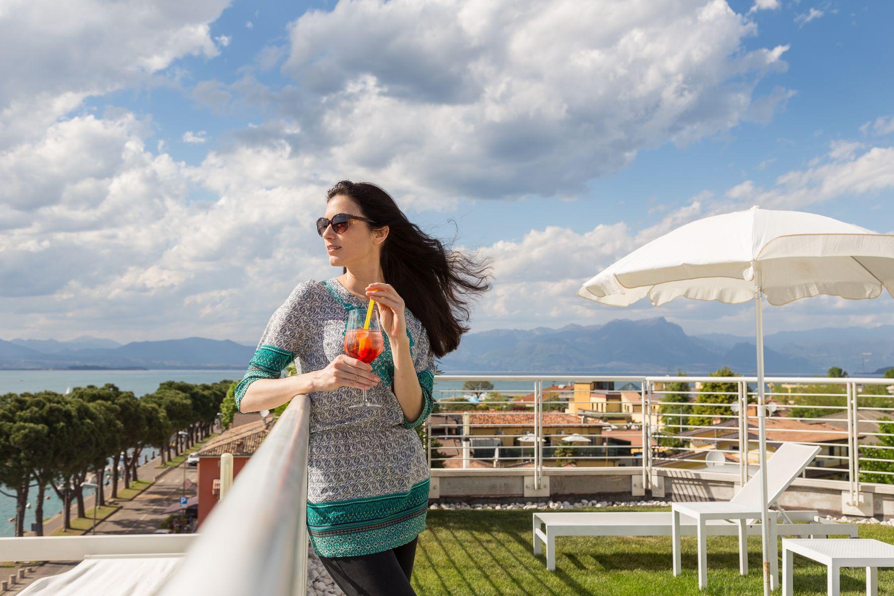 Die Panoramaterrasse im 4. Stock ist der eigentliche Höhepunkt unseres Hotels: Sie bietet einen bezaubernden 360°-Blick auf den See und die alten Stadtmauern von Peschiera, einen beheizten Whirlpool*, Liegestühle und Sonnenschirme zum Sonnenbaden und kostenlose Handtücher.